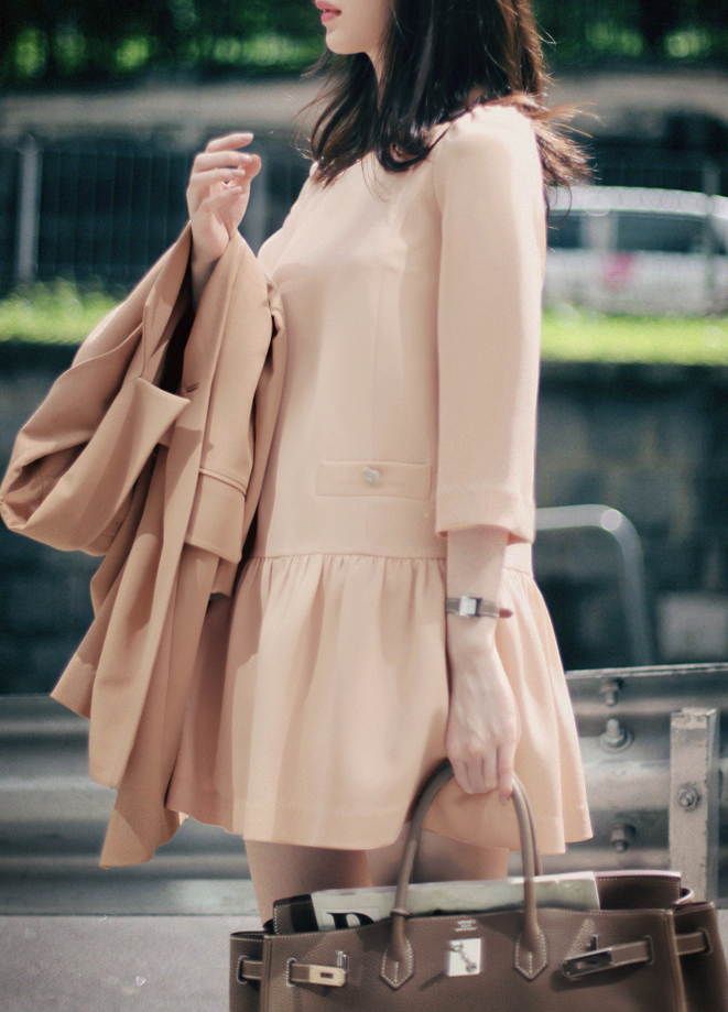 I absolutely adore this look, which combines an array of soft neutrals from the dress to the classic accessories. The silhouette of the dress (particularly in the blush hue) is beyond darling. I found this style, which is quite similar designed by Cynthia Rowley that I will most certainly need to add to my wardrobe immediately.